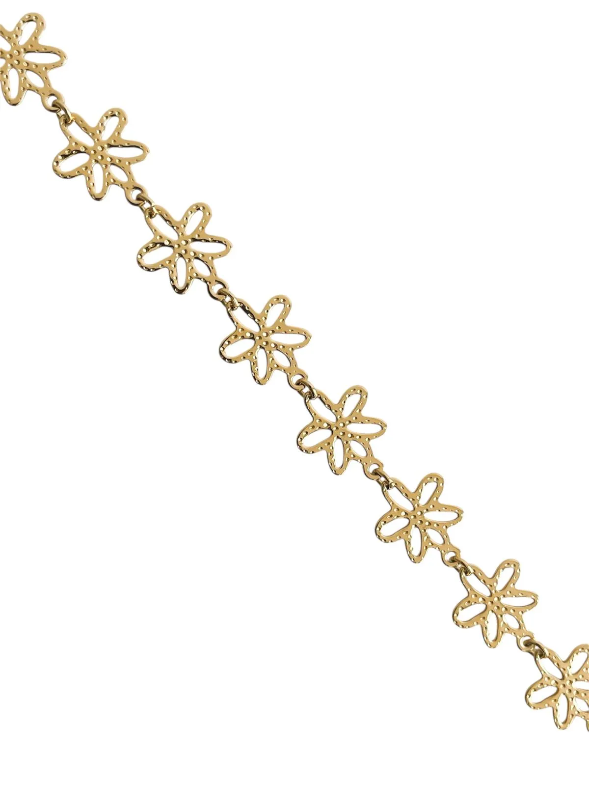 Bracelet doré en acier inoxydable au motif floral délicat. Composé de maillons en forme de fleurs à six pétales, il offre un style raffiné et féminin. Taille ajustable.
