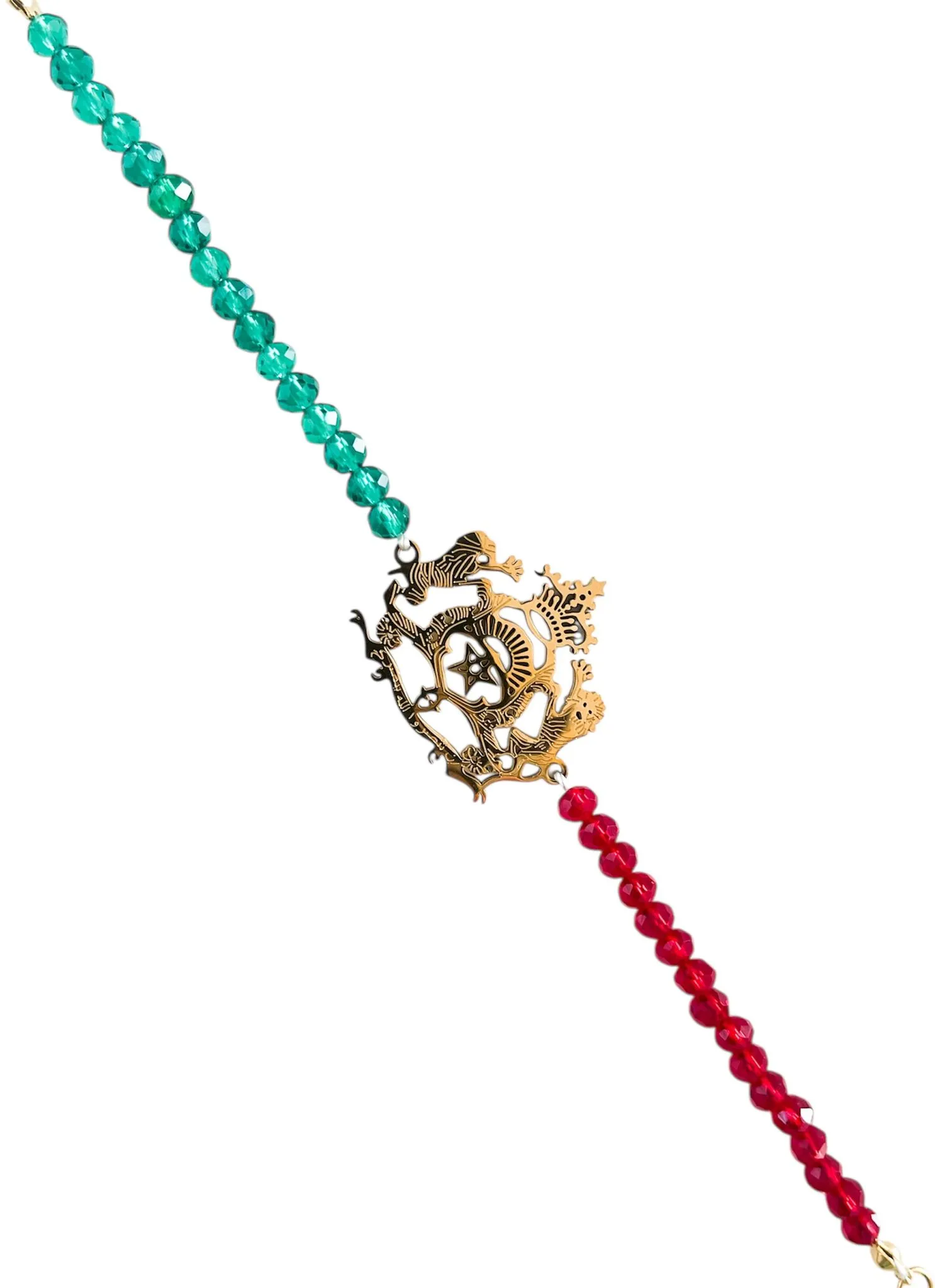 Bracelet élégant composé de perles rouge et vert facettées, sublimé par une médaille dorée représentant le Maroc. Un bijou symbolique, lumineux et intemporel.